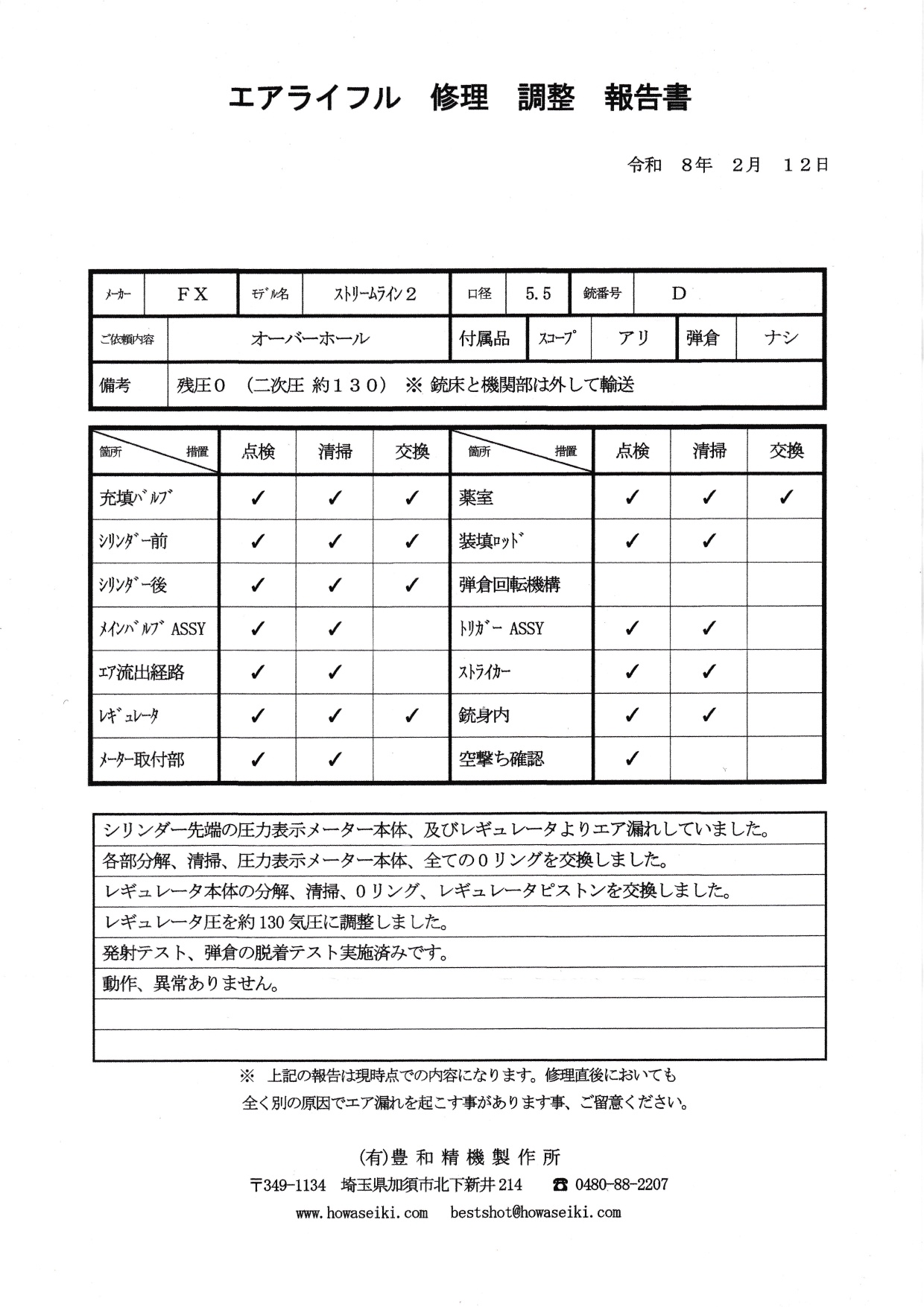 令和元年に買うて7年半でレギュレーターからエア漏れしたので豊和精機製作所でオーバーホールして貰いました。